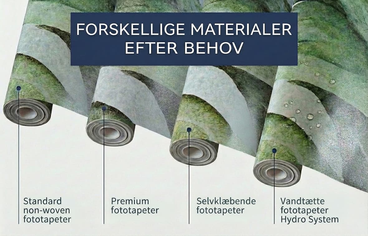 - Vandtæt (Hydro System 170 g/m²): Perfekt til vådrum som badeværelse og køkken eller gangarealer. Sættet indeholder fototapet, speciel akrylak, lim og værktøj. Installation i to trin giver en overflade, der er modstandsdygtig over for fugt, ridser og rengøringsmidler (Klasse 1).