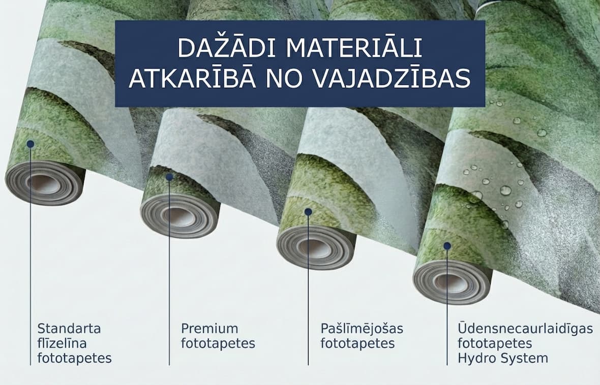 - Ūdensizturīga (Hydro System 170 g/m²): Ideāls risinājums vannas istabām, virtuvēm un bērnistabām. Komplektā ietilpst fototapete, akrila laka, līme un instrumenti. Divpakāpju uzstādīšana rada virsmu, kas ir izturīga pret mitrumu, skrāpējumiem un tīrīšanas līdzekļiem.